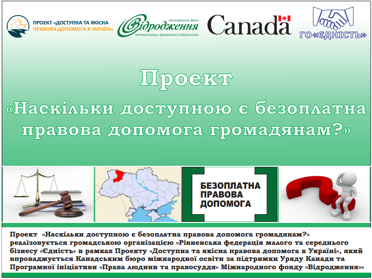 Проект “Наскільки доступною є безоплатна правова допомога громадянам?”, реалізовується у рамках проекту «Доступна та якісна правова допомога в Україні», що впроваджується Канадським бюро міжнародної освіти за підтримки Уряду Канади та Міжнародного фонду «Відродження».