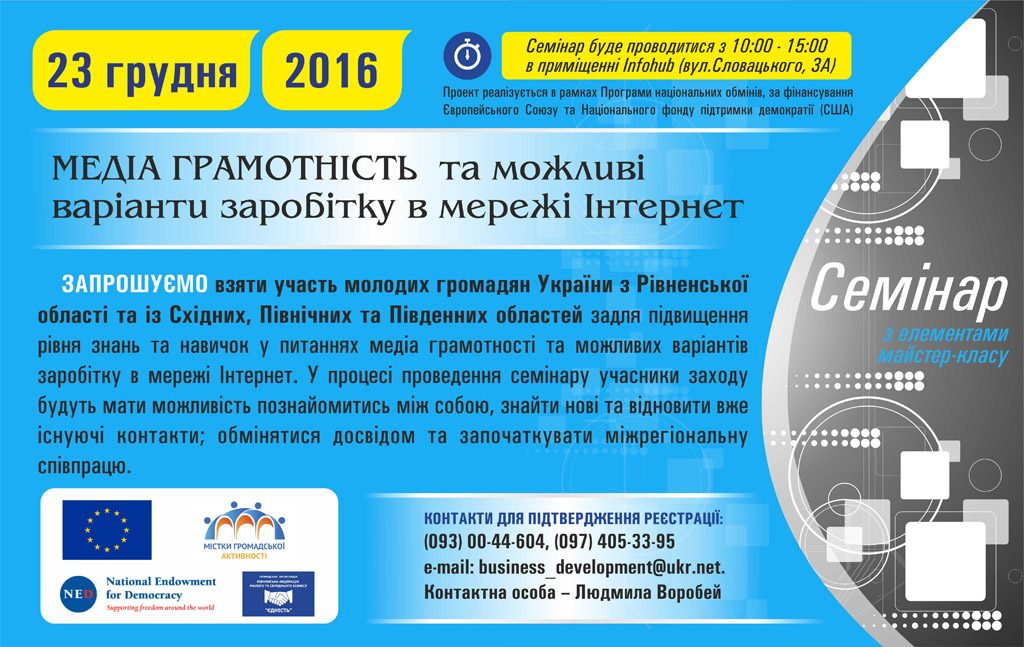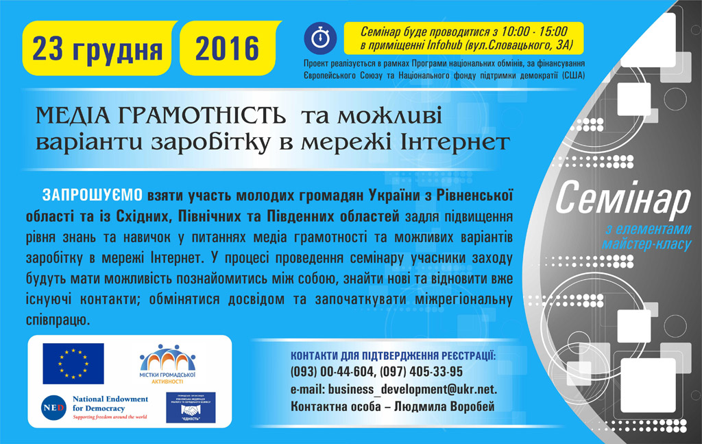 Проект «Медіа грамотність та можливі варіанти заробітку в мережі інтернет”, який реалізовано в рамках Програми національних обмінів, за фінансування Європейського Союзу та Національного фонду підтримки демократії (США).
