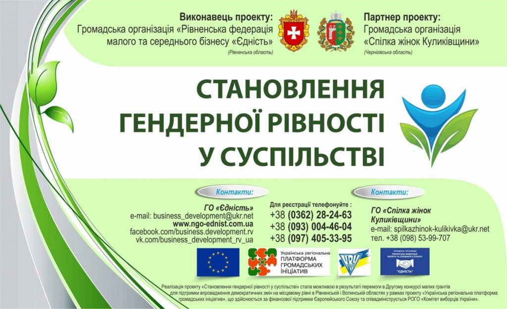 Мета проекту: протягом 5 місяців на території Рівненської та Чернігівської областей значною мірою підвищити рівень обізнаності населення в питаннях гендерної рівності у всіх сферах суспільного життя та шляхів її досягнення.