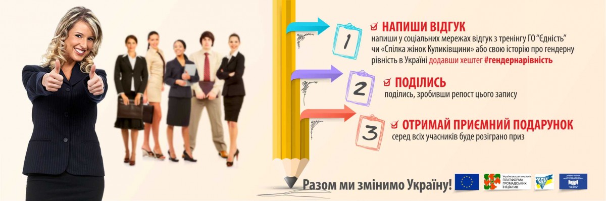 Теперь ми запрошуємо Вас поділитися у соціальних мережах (Facebook, Instagram, тощо) відгуком з тренінгів ГО “Єдність” чи ГО «Спілка жінок Куликівщини» (супер якщо з фото) чи своєю історією про гендерну рівність в Україні з хештегом #гендернарівність.