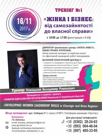 Перший тренінг – «Жінка і бізнес: від самозайнятості до власної справи» відбудеться 16 листопада. Тренером виступить Володимир Новацький – автор власних методик та майстер-класів ефективної командної роботи менеджерів, директор тренінгового центру «Лотос-Інвест».